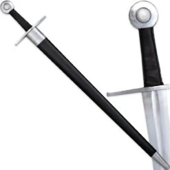 This Knightly sword is made from EN45 high carbon steel with a straight cruciform cross-guard and circular pommel. The grip surrounding the full tang is wood that has been wrapped in genuine black leather. A shallow fuller runs down the middle almost the entire length of the blade. This sword is full tang and battle ready with a peened pommel. Peening is the method historically used for most of the pre-industrial era. It fixes the pommel permanently to the tang. This durable blade is strong and ready for re-enactments or tournaments. Included is a wooden scabbard with a rexin wrap and steel locket and chape. Finish off a costume or star in a play with this amazing historical replica. Overall Length: 37.75 Inches.