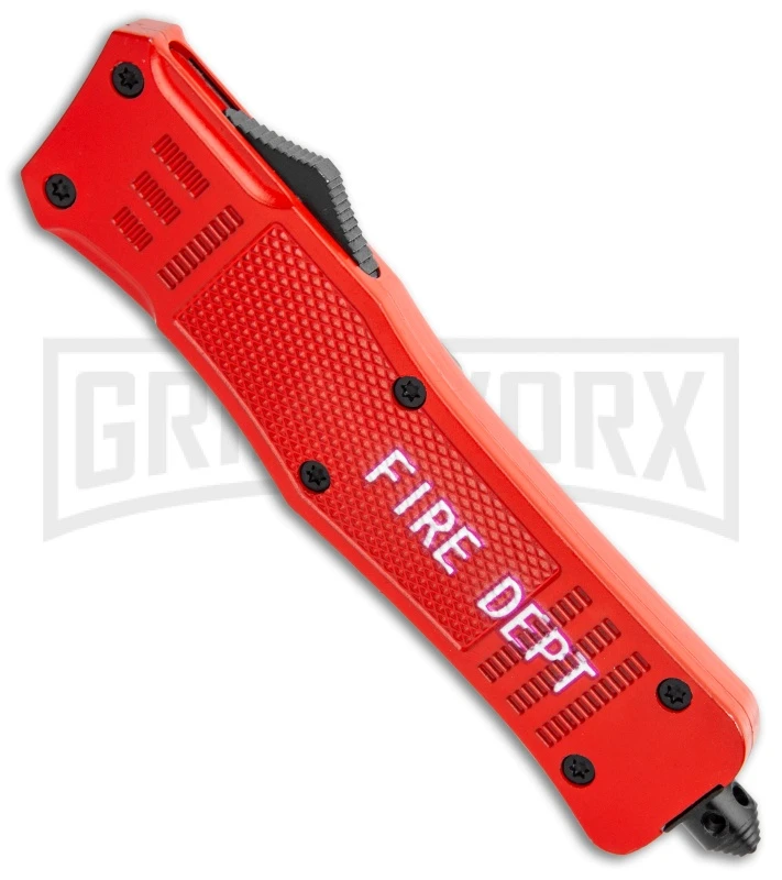 This Fire Dept. Edition Atomic Defender OTF model has a red handle and a two-tone finished dagger blade with a partially serrated edge.