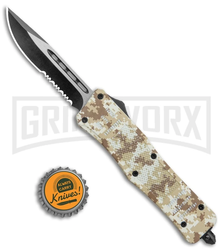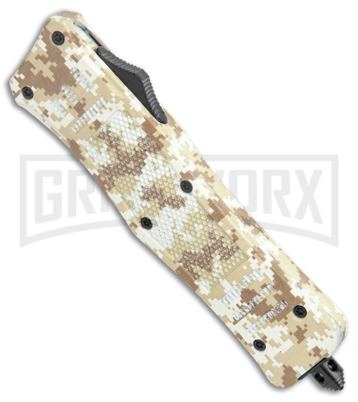Atomic Defender Med OTF Auto Tan Camo Knife (3.25″ Two-Tone Serr)