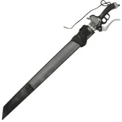 Straight from the dystopian world of the popular anime series Attack on Titan, this is an exact replica of the fearsome sword used by main character Ehren to battle the awesome titans and help protect what remains of humanity. Beautifully hand painted with fine attention to detail, the 36 inch long sword features a 27.5 inch blade constructed from carbon steel- the blade comes unsharpened so it is perfectly suitable for costume use. The handbrake style handle is black with silver accents and features an actual trigger that can be squeezed- in the anime this is used to control the soldiers Vertical Maneuvering Equipment but here just makes for a nice touch of realism along with the long leather braided tassel at the pommel that is used to connect the users equipment. Overall Length: 36 Inches Blade Length: 27.5 Inches Blade Material: Carbon Steel Handle Length: 8.5 Inches Guard Width: 5.5 Inches Guard Material: Aluminum, Powder Coated Black, Chrome accents Item Includes: Leather Sheath with Adjustable Back Strap