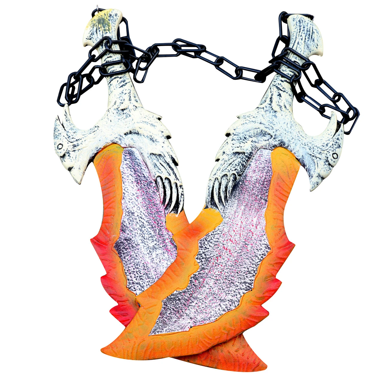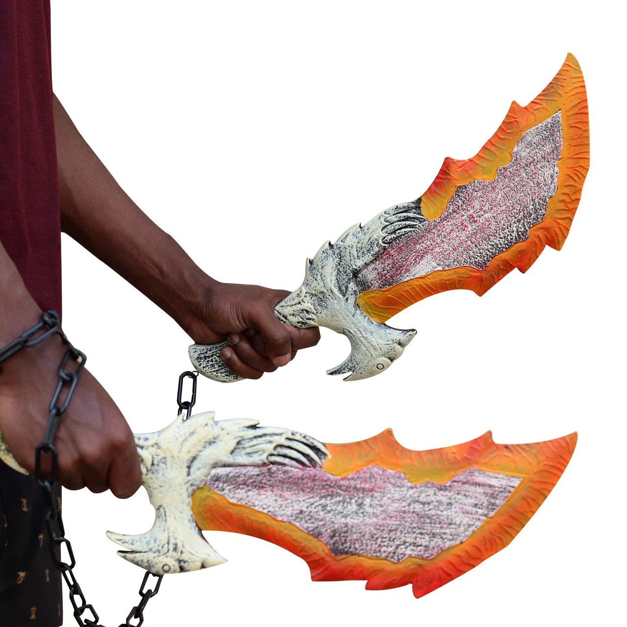 Awesome pair of swords based on the Blades of Athena given to Kratos at the end of the first God of War game to replace the original Blades of Chaos destroyed by Ares. Intricately detailed, a fierce fiery glow effect represents the godly magic emanating from each blade. A mighty blade fit for a god, it measures an incredible 8.5 inches across at its widest point and looks like it could be straight out of the video game. Constructed from high quality Polyurethane foam with a PVC inner core, an antique finish has been applied to give an aged and authentic look. Hand painted and featuring intricate details from end to end, this sword is part of our Junior Warlords Collection of high quality foam padded weapons that are great costume additions for cosplay and/or live action role play while being perfectly safe for children- awesome products for both the young and the young at heart! Overall Length: 26.5 Inches Blade Length: 17 Inches Handle Length: 6 Inches Weight: 9.6 Oz Inner Core: PVC Outer Material: Polyurethane Foam Features: Silver, Black, Gold, Grey Lacquer Finish