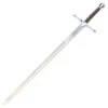 The Elucidator Anime Sword Replicas wooden handle is wrapped in faux black leather with black aluminum pommel and accents. The blade has a black anodized finish with a satin steel edge. Included is a Leather Sheath. Overall Length is 49.75 inches.