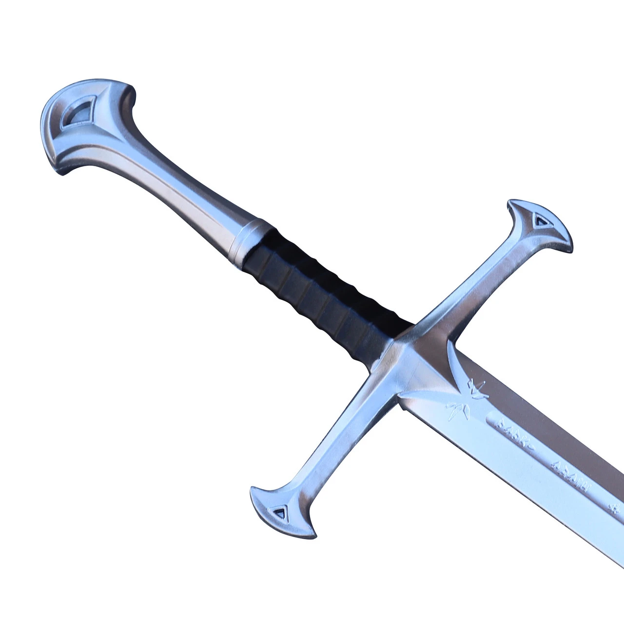 This sword is greatly inspired by the sword made for Aragorn from the remnants of the legendary great sword, Narsil. The 42” replica foam sword is constructed from durable polyurethane foam and has a 10 mm inner core, so it can withstand play fighting while retaining its shape. The handle features a ribbed design with a black finish, and is surrounded by a pewter-painted pommel and cross guard. Overall Length: 42 inches, Blade Length: 32 inches