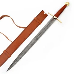 Odin’s own special elite group of warriors were Berserker warriors characterized but wearing wolf pelts while in a state of battle fury. They were called Úlfhéðnar or wolf warriors. These men were indestructible and fierce on the battle field. It is said they would walk out on to the battlefield bare chested howling in a frenzy but no weapon would penetrate their skin. While intimidating their enemies they would bite their own swords and shields like crazed savages. Swords like this would have been used by these exceptional men in battle, exceptional but brutal. This sword is hand forged with Damascus made from1095/15n20 Alloy Steel. There are 176 blade layers that have been tempered around 54 to 55. The twist design is absolutely stunning. The super sharp blade will make quick work on the battle field cutting down your opponents. The guard and peened pommel are both made from real brass. Leather wraps a wooden handle for comfort. Included is a handmade leather back sheath for carrying your sword with you. This blade is battle ready and thirsty for action.