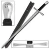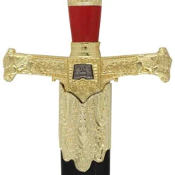 Elaborately designed King Solomon sword with mirror polished blade forged from 440 stainless steel and adorned with intricate laser etchings. Golden plated guard features kippah wearing Lions of Judah on both ends of the quillons while the center of the crossguard features an inset with a Menorah on one side and an image of the Arc of the Covenant on the reverse, both central images are positioned atop a Star of David. The handle is ringed with gold accents with a faux leather grip while the pommel has a large Star of David. The scabbards chafe and locket both showcase intricately etched designs, with the chafe displaying an ornate representation of the story of the Queen of Shebas visit with Solomon as an image of the queen herself is framed by her many gifts for the fabled king. Overall Length: 29 Inches Blade Length: 23 Inches Blade Material: 440 Stainless Steel, Mirror polished finish Blade Style: Dagger Point Blade Thickness: 3.15 mm Handle Length: 6 Inches Handle Material: ABS Material with Aluminum Gold Finish Rings Includes: Leather wrapped wood scabbard