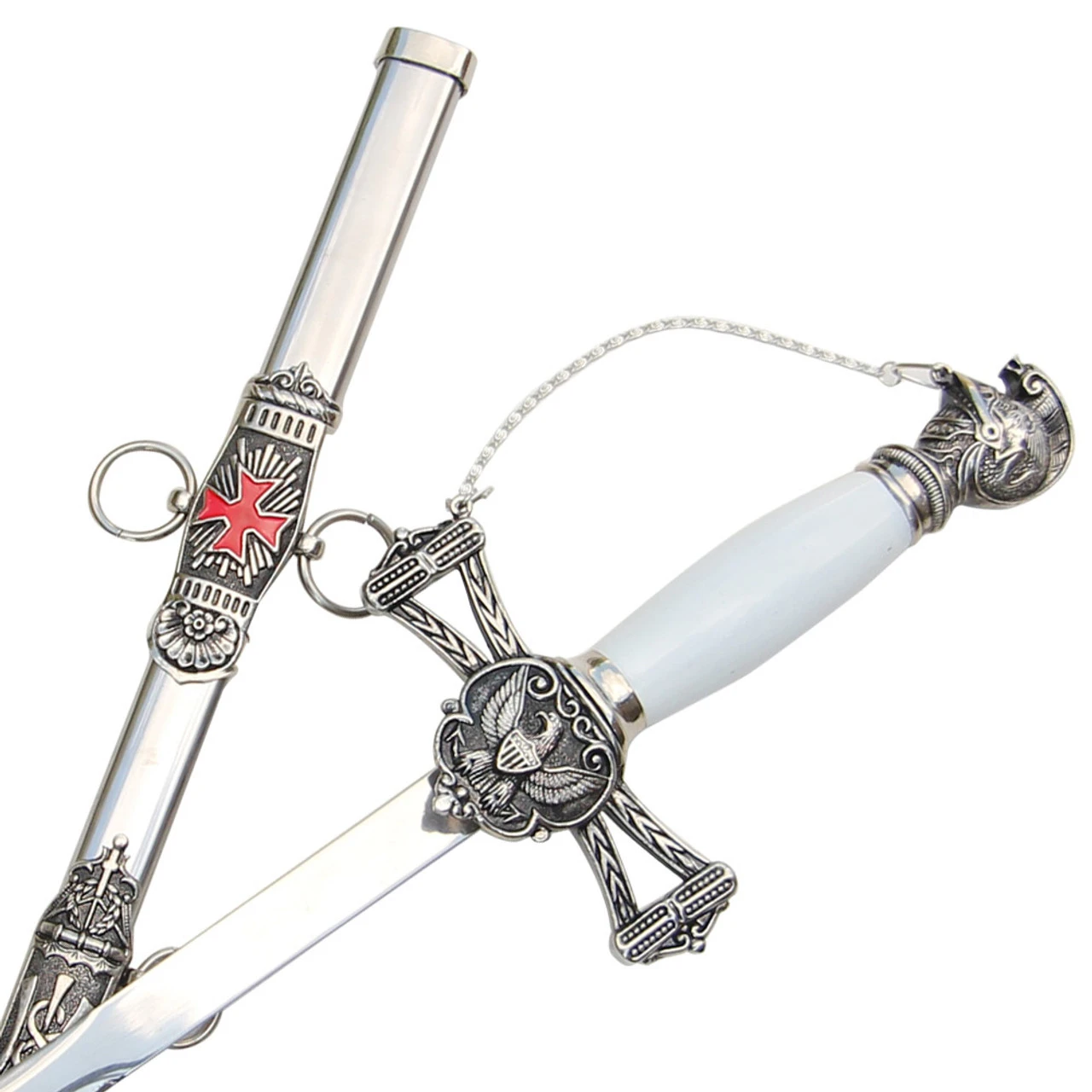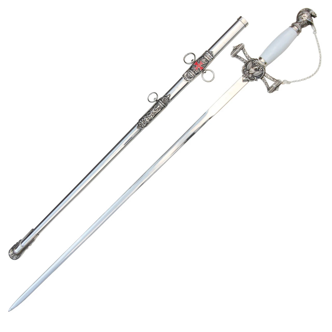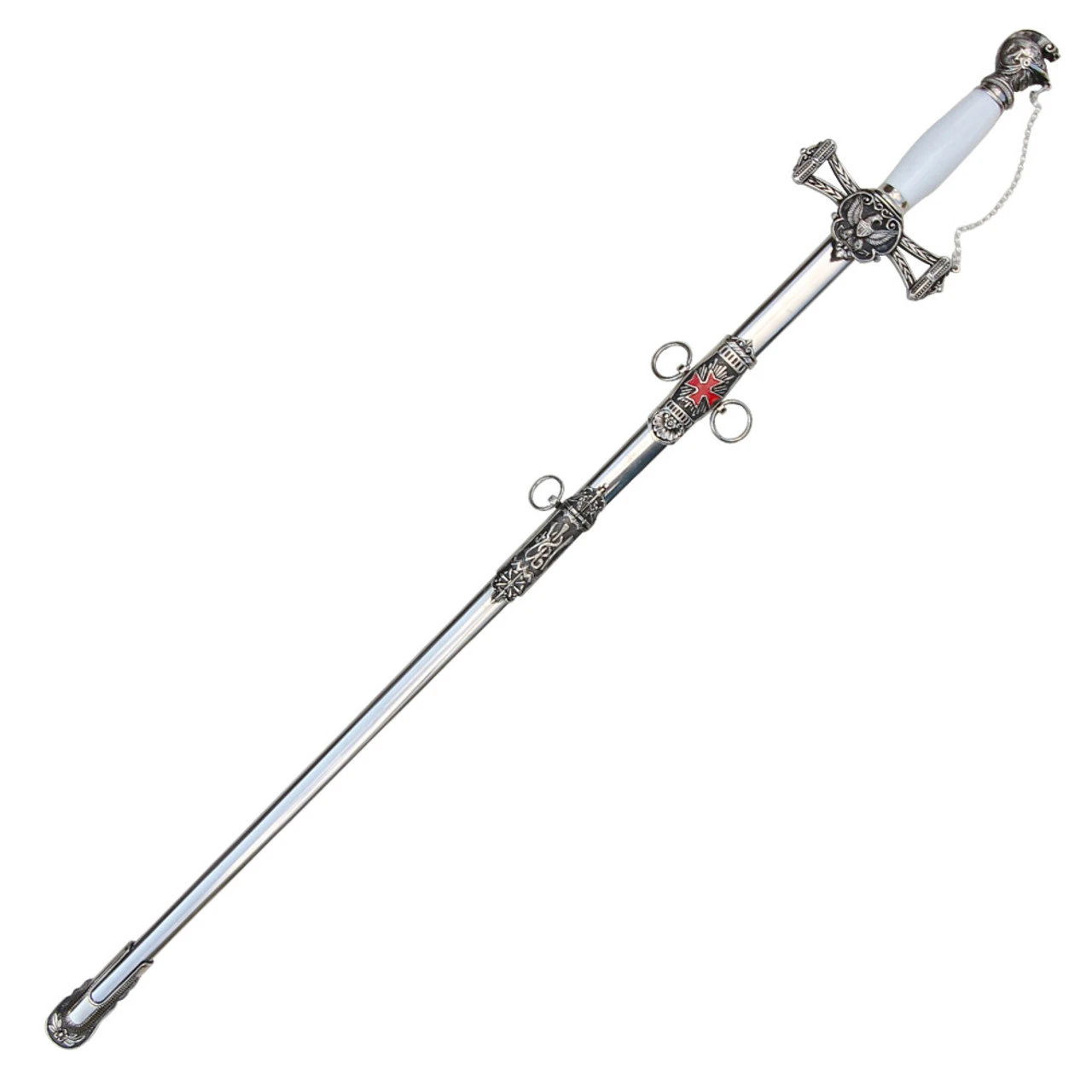 The blade of the sword is polished 440 stainless steel with slightly sharpened edges and a very sharp point. A ridge runs down the center of the blade to a long Ricasso. A Maltese Cross in relief rests in the center of the Ricasso with the words “Knights St. John.” The scabbard of the sword has been constructed from polished stainless steel with ornate fittings. Three carrying rings have been added to the scabbard. A Red Maltese Cross decorates the fitting securing the carrying rings. The scabbard throat is steel. The guard of the sword is a cut out Quillon design with an eagle in the center. On the opposite side of the eagle is another Maltese Cross. The handle is black with a golden Knights Helm and a chain guard.
