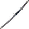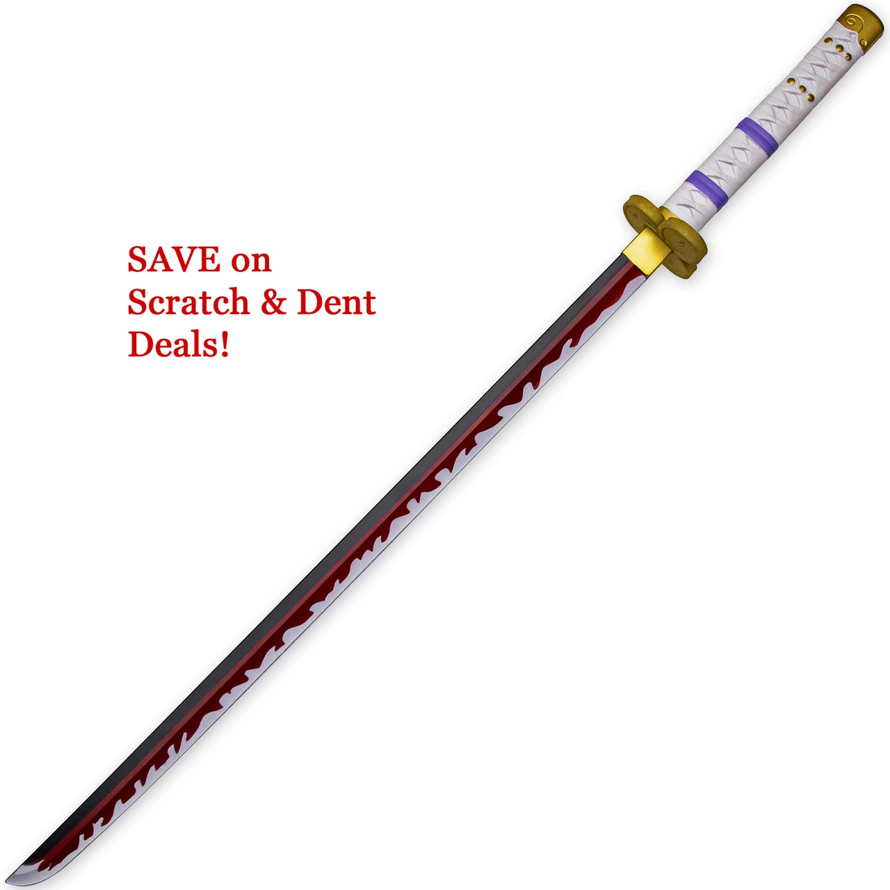 This replica may be made of foam, but it is certainly no children’s toy. This Ame no Habakiri katana sword is composed of polyurethane foam and features a 10 mm fiberglass core. Polyurethane foam is both durable and flexible, and the added fiberglass core creates a strong sword that can be used for cosplay as well as kicking bad guy butt in mock battle. The blade base is black and features a jagged red and white painted Hamon. The handle is molded to simulate a traditional Japanese wrapping in white cloth, with an underlayer of white ray skin. Purple banding and gold simulated studs are also featured on the handle. An ornate gold pommel tops the handle, and the gold foam guard that has a trefoil design comes detached for easy assembly. A mock habaki separates the blade from the handle. Included with your purchase is a matte white hard plastic scabbard with painted gold detailing and vinyl stick-on floral decals to perfectly match the sword in the anime series. Due to some slight imperfections in the scabbard design, this replica cosplay sword is offered at a deal you simply CANNOT pass up! Overall Length: 39.25 inches, Blade Length: 29 inches