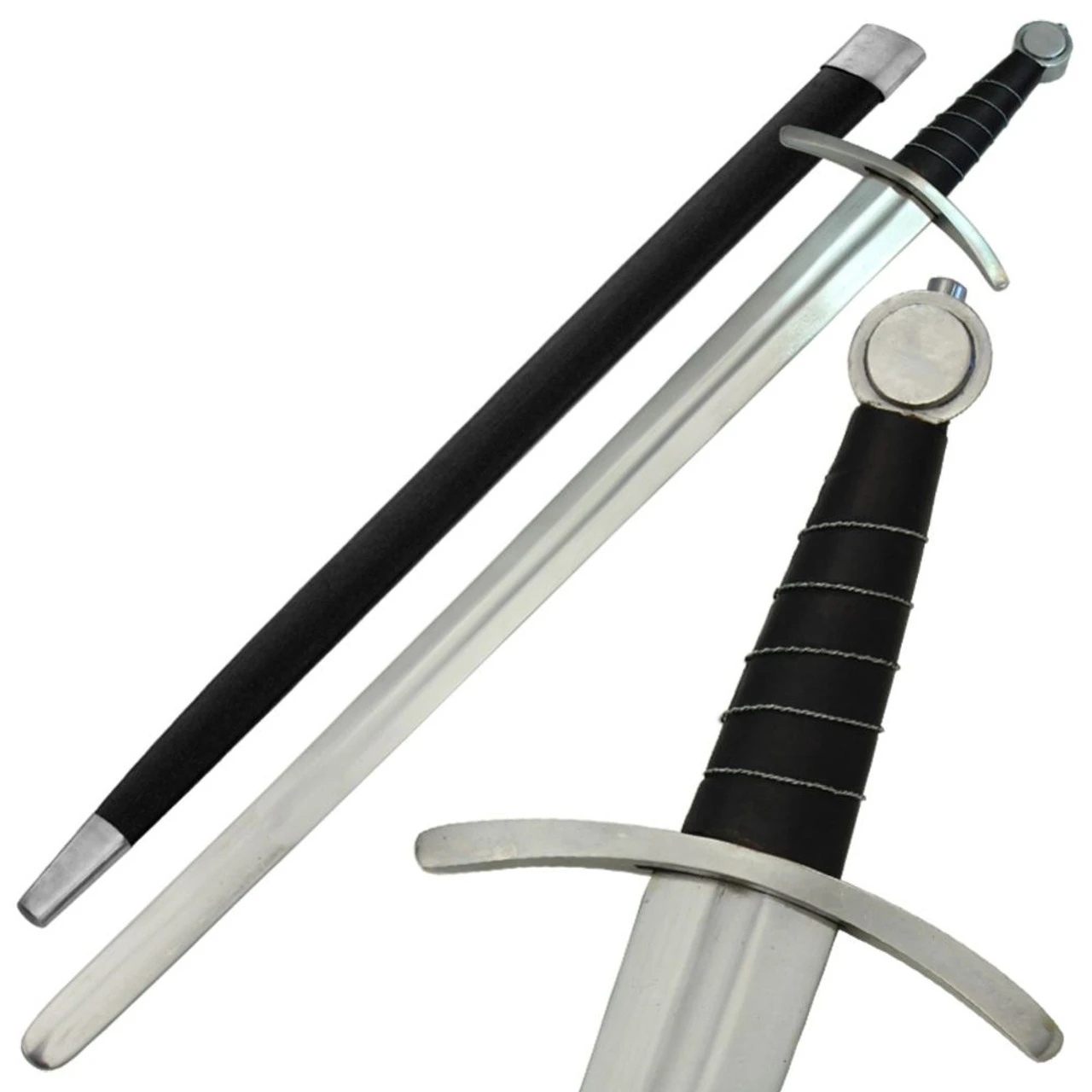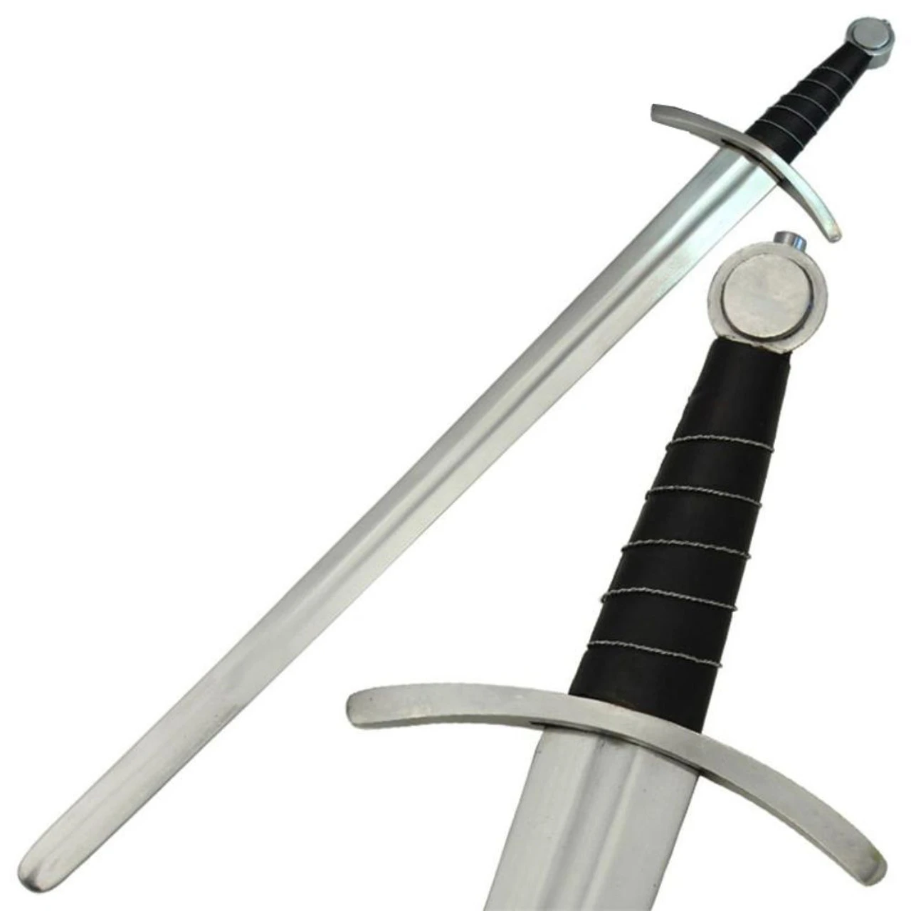 The Last Crusader Medieval Knights Renaissance Broadsword Replica is constructed of mirror polished steel with a factory edge. The handle is wrapped in leather with twisted wire for decoration. Overall length is 36.50 inches.