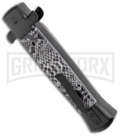 This Mago OTF model features a satin finished bayonet blade and a black, acrylic “Cottonmouth” handle.