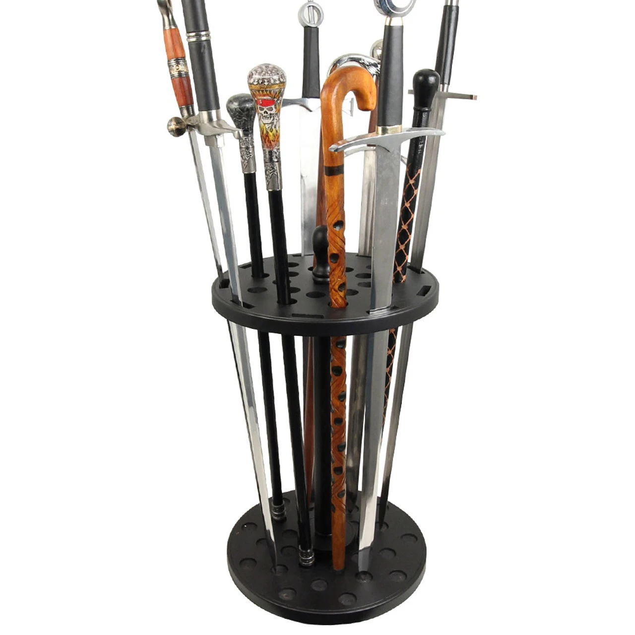 It holds up to 18 walking canes and 9 swords. It comes with a sturdy construction so if you are a collector of swords, canes, or sword canes.Overall Height: 27.50 Inches.