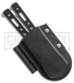 The Morphite butterfly knife is an economical knife with smooth rotation and great tactile feedback. The stainless steel blade of the Morphite features a bead blast finish, clip point style, fuller, and two tang pins that improve lock-up and reduce blade wear. The stainless steel handles feature torx screw and sandwich construction, aluminum scales with a black powder coating, and a T-latch. Comes with an ABS holder.