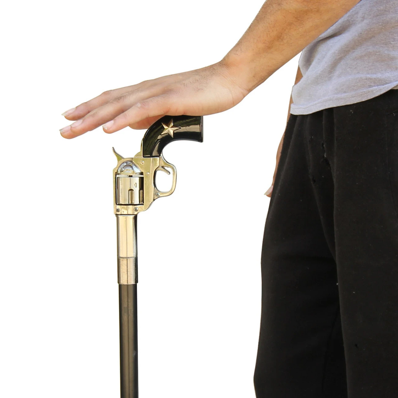 Take a breath. Calm your mind and get the target in your sights. Exhale and shoot. The Quickdraw Outlaw Sword Cane is a beast of a cane. A 29.75-inch-long shaft is capped with a rubber end cap for scratch resistance. The handle of this cane is modeled after the Colt 45 Single Action Army Special revolver and features a free-spinning chamber to give the design even more authenticity. A lone star is featured on the grips of the revolver handle. The handle twists off to reveal a stainless-steel blade affixed to the end of the barrel. Both sides of Quickdraw Outlaw’s blade are dull which make this cane perfectly safe as well as the perfect costume piece with its dynamic movement and intricate detail. Overall Length: 36.5 Inches. Weight: 1.45 lbs.