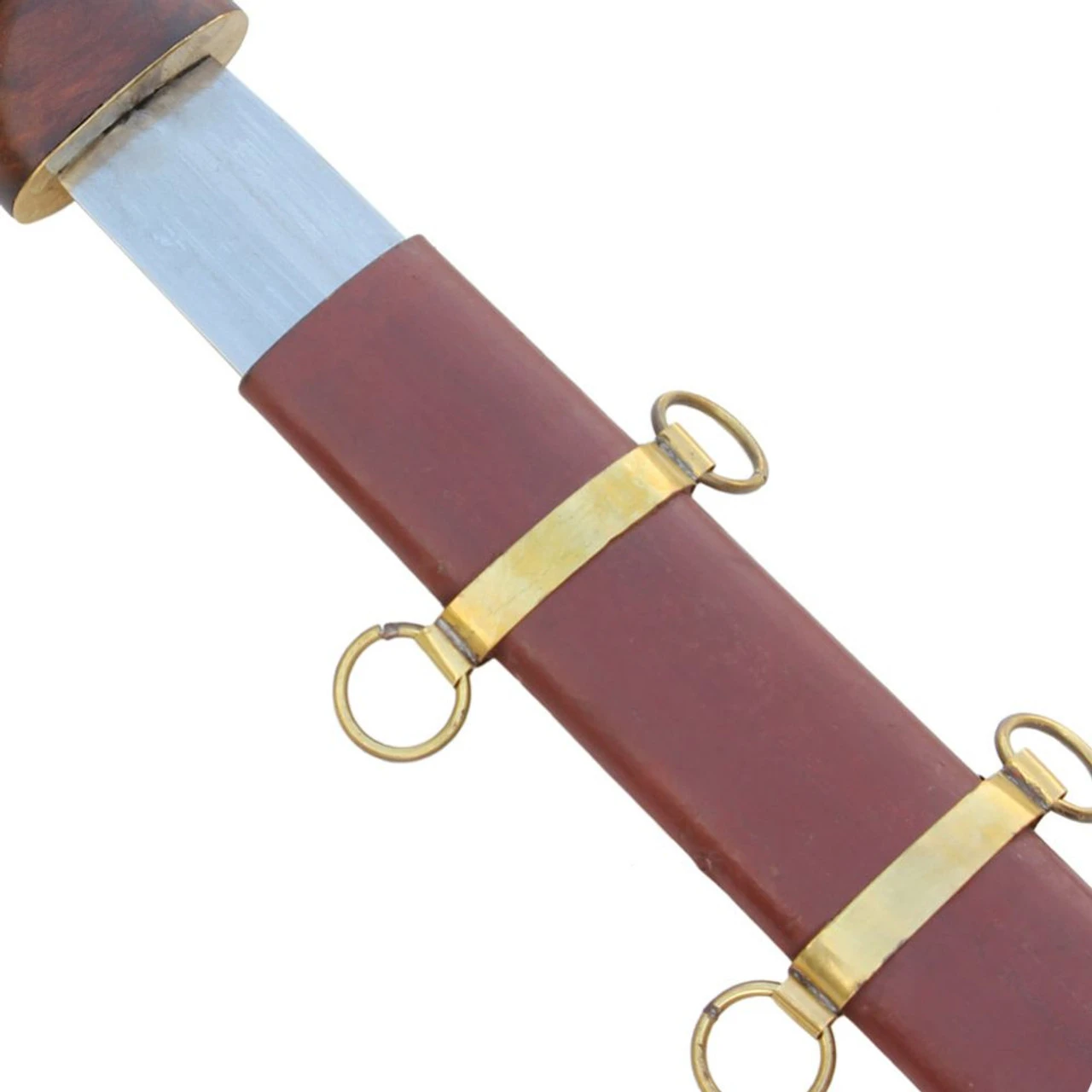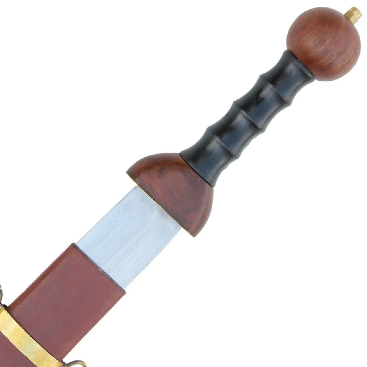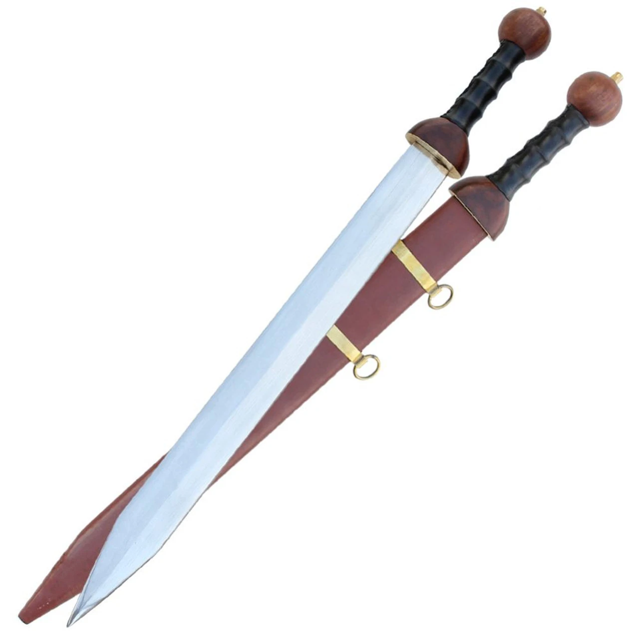 The Roman Pompeii styled Gladius is one of the most famous swords, wielded by one of the most formidable fighting forces known in history. Reflecting the close ties between the military and the arena, the word gladiator comes from the word gladius. The gladius was the favored weapon of the Roman armies, and in trained hands, this blade became one of the most effective in history. The Roman Arena Pompeii Gladius is modeled after the traditional Pompeii gladius, which featured parallel edges and a triangular tip. The solid wooden grip has ridges that fit each finger and is wrapped in high grade black leather. The round pommel is hand carved from Hardwood with a Brass tip for looking pretty and smashing skulls. This gladius comes with a wooden scabbard that is wrapped in red-brown leather and hand-sewn on. Shiny polished brass fittings decorate the scabbard for use with a strap.