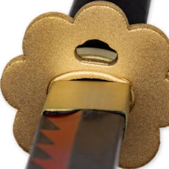 This replica may be made of foam, but it is certainly no children’s toy. This Shusui katana sword is composed of polyurethane foam and features a 10 mm fiberglass core. Polyurethane foam is both durable and flexible, and the added fiberglass core creates a strong sword that can be used for cosplay as well as kicking bad guy butt in mock battle. The blade is completely black apart from a painted red Hamon with a jagged shark-tooth design. The handle is molded to simulate a traditional Japanese wrapping in black cloth, with an underlayer of white ray skin. A painted gold pommel tops the handle, and the gold foam guard that has a flower like octofoil design comes detached for easy assembly. A mock habaki separates the blade from the handle. A shiny black hard-plastic scabbard is included with your katana, decorated with a golden tsuba and kojiri end cap as well as dark red painted circles split into even thirds just like the anime.