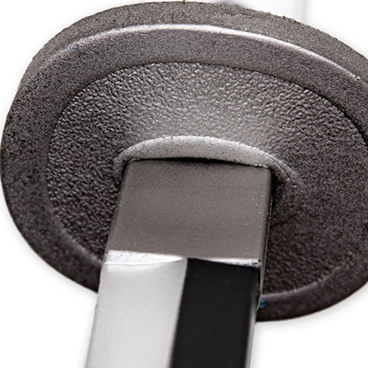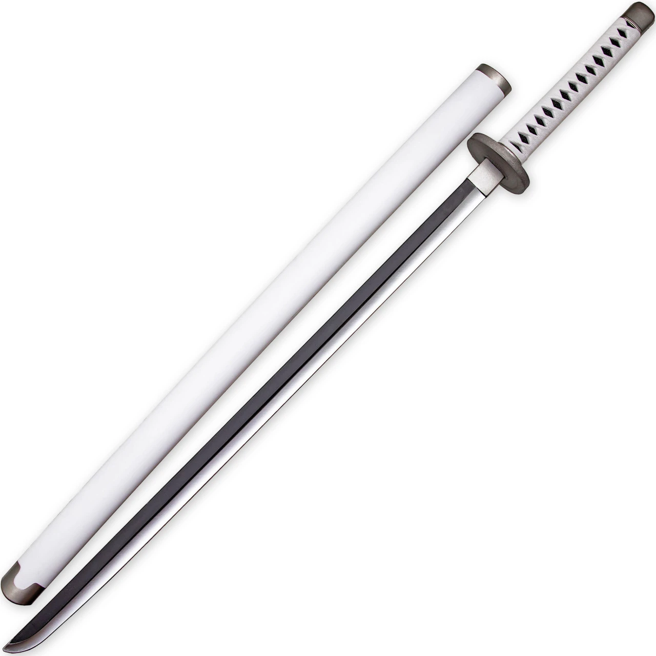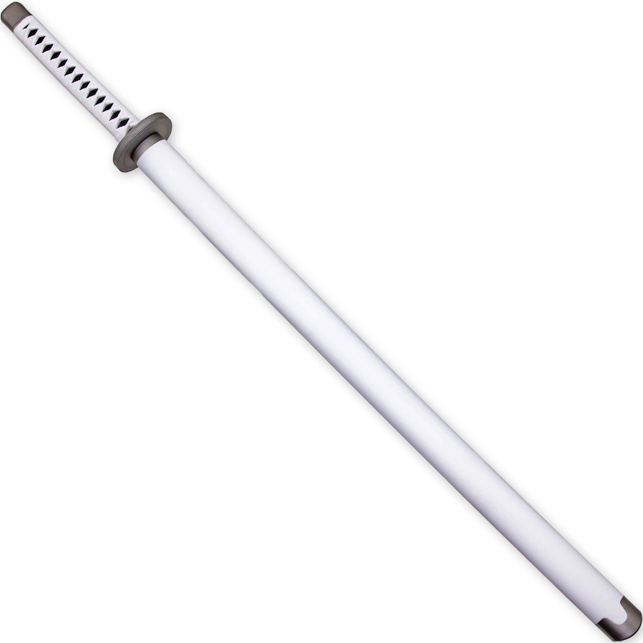 This replica may be made of foam, but it is certainly no children’s toy. This Wado Ichimonji katana sword is composed of polyurethane foam and features a 10 mm fiberglass core. Polyurethane foam is both durable and flexible, and the added fiberglass core creates a strong sword that can be used for cosplay as well as kicking bad guy butt in mock battle. The handle is molded to resemble a traditional Japanese wrapping in white cloth, and an underlayer of black ray skin. The circular silver foam hand guard (or Tsuba) comes detached and assembly is extremely simple. A mock habaki separates the blade from the handle. A fully white scabbard composed of hard plastic is included with this sword so you can safely carry your new prop around your next convention.