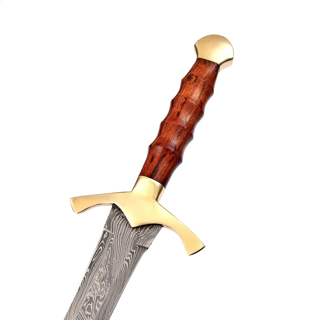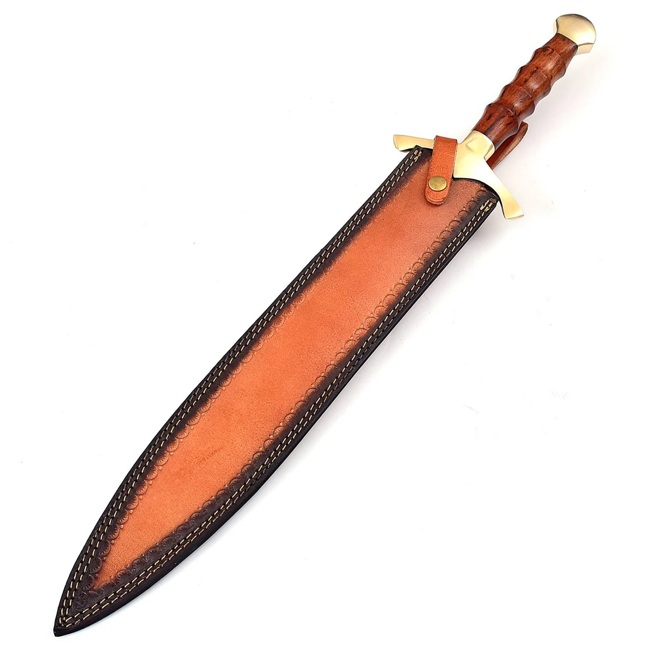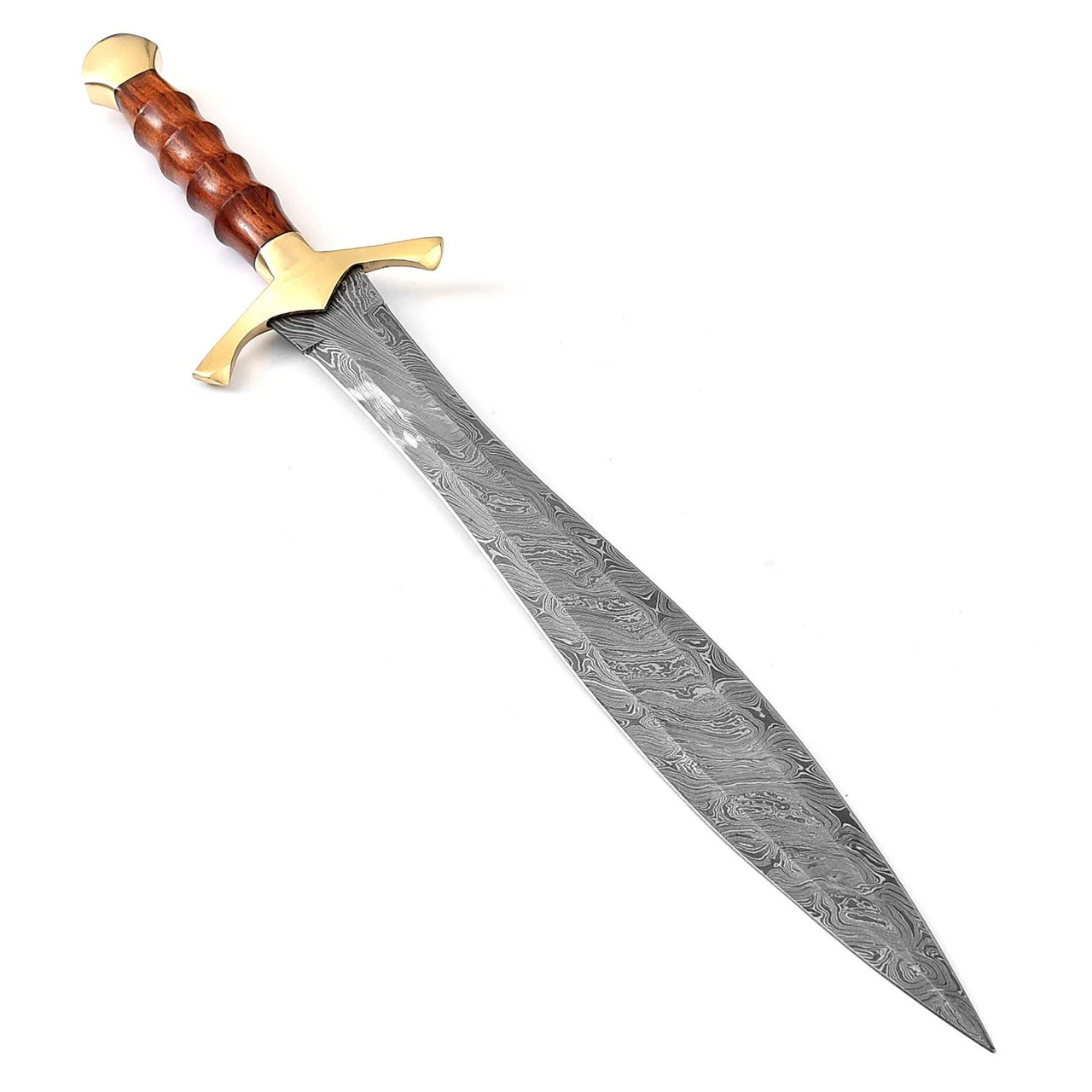 The blade is hand forged by expert craftsman from Damascus steel. 400-520 layers heated and folded over and over give the blade that striking wave-like appearance. The 1095/15N20 steel we use has a Rockwell Hardness rating between 58-60. The handle is carved from wood and stained a rich pecan finish, which is complimented well by the 100% pure brass hand guard and pommel. This beautiful handmade sword would be a perfect piece to add to your collection, and even comes with a complementary genuine leather sheath. Overall Length: 25.5 inches, Blade Length: 17.75 inches
