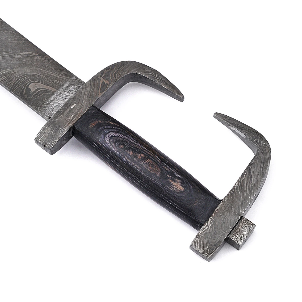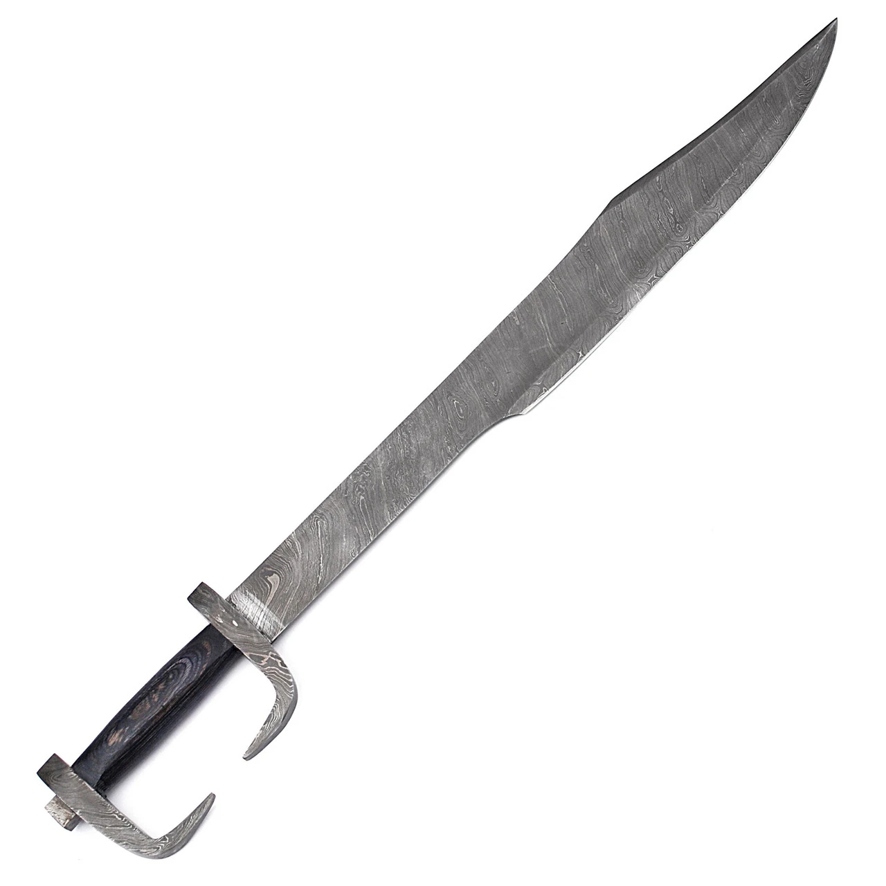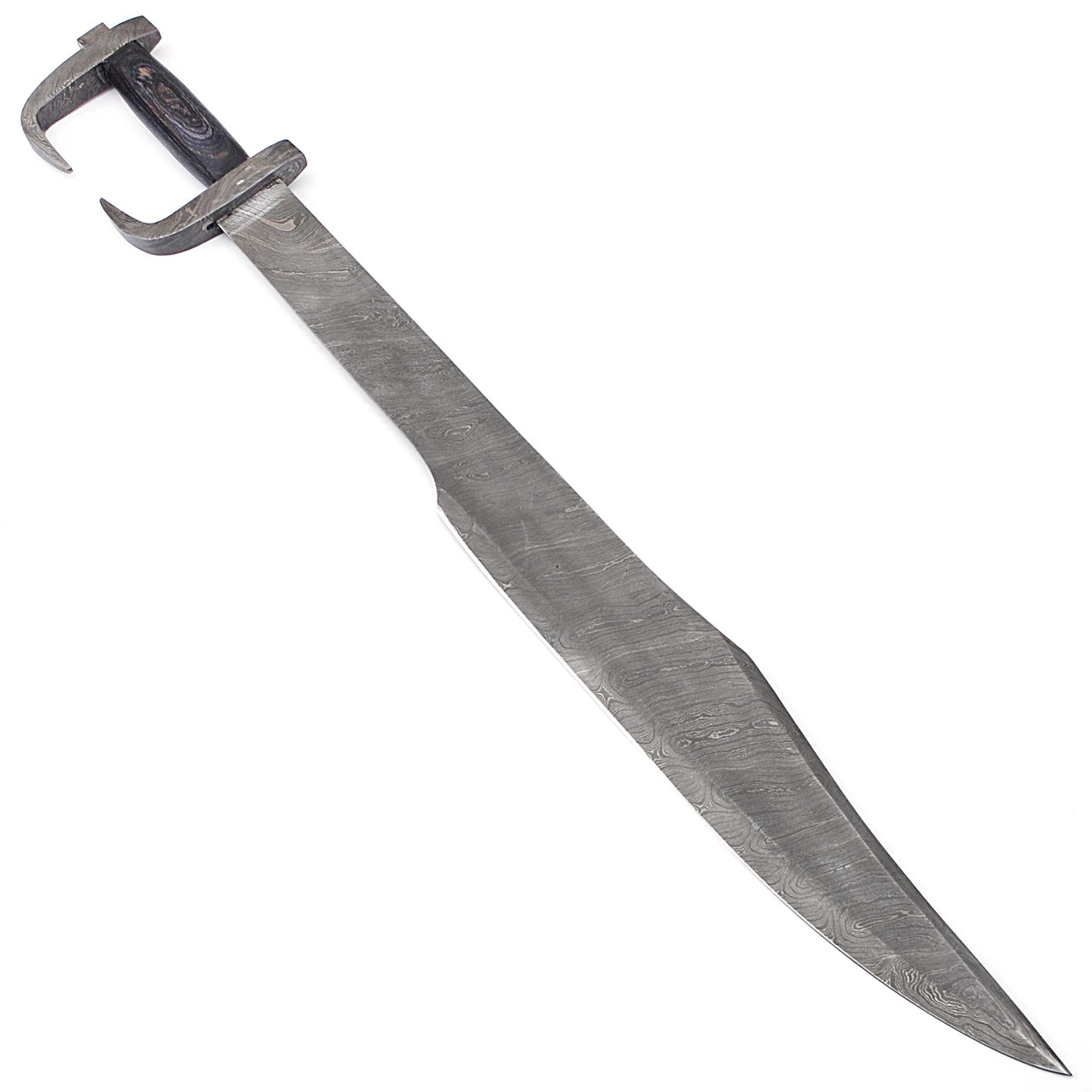 The King of the ancient Greek swords, this Damascus steel sword is powerful and famous for its unique artistic style. This sword narrows at the shoulders and widens towards the tapered and curved tip giving the forward -cleaving edge. This sword is known for its maneuverability and its sleek design allows for close combat and will deliver only the deadliest of thrusts. Damascus steel is known for its durability, sharp edges, and the technique in creating the steel blade design. The dark Pakkawood handle ensures optimal grippability with the pommel that mimics the guard which is shaped for ideal protection. This sword includes a leather sheath scalloped with darkened edges. Also, a comfortable back strap on the sheath allowing you to carry your sword with confidence. Overall Length: 31.75 Inch