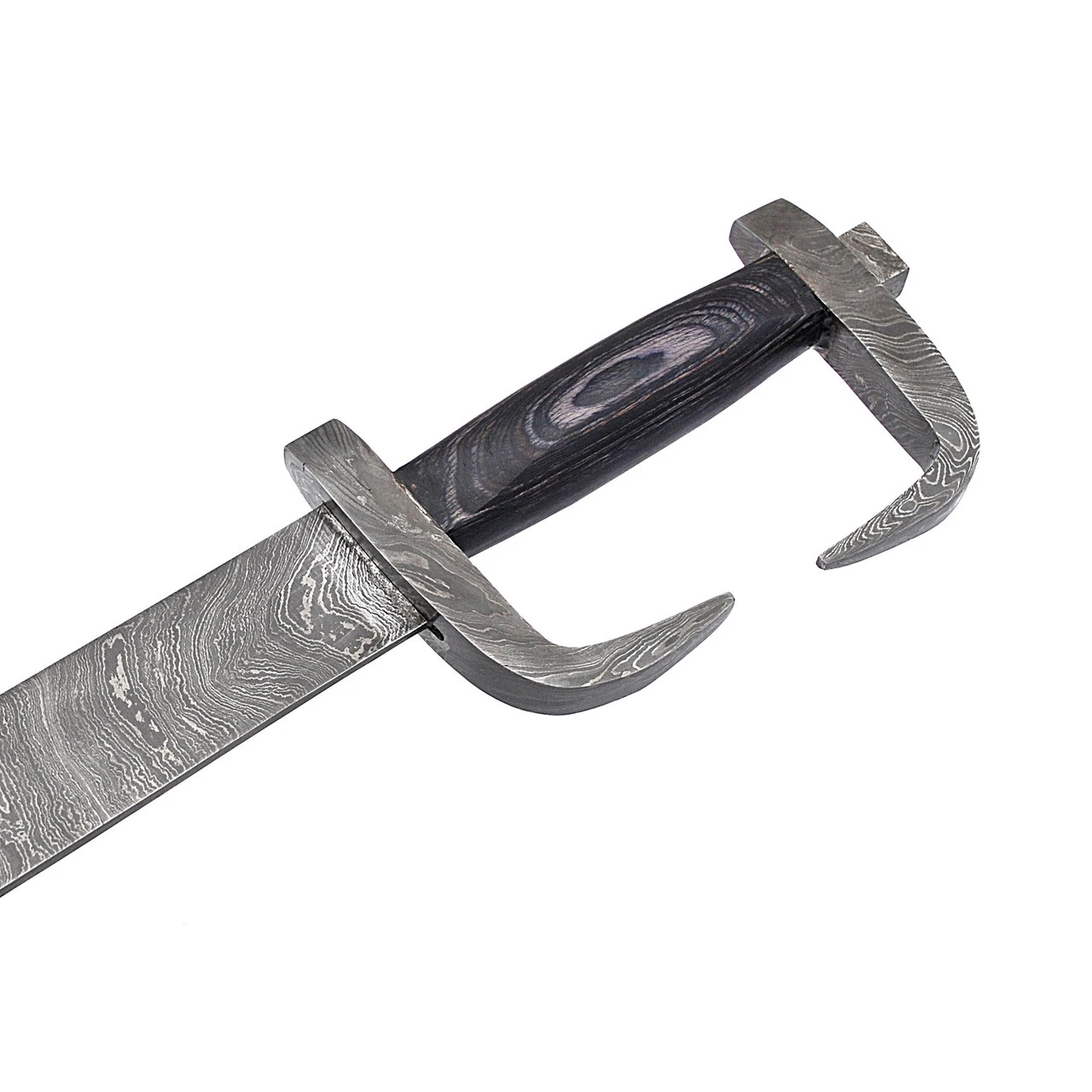 Features:SharpenedBlade Material: Damascus SteelLayers: 400-520HRC: 58-60Steel: 1095/15N20Handle Material: Pakkawood DarkGuard and Pommel: Damascus SteelLeather Sheath back strap Included Darkened Edge with Scalloped leather Specifications:Overall Length: 31.75 inchesBlade Length: 25.0 inchesHandle Length: 6.75 inches