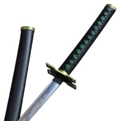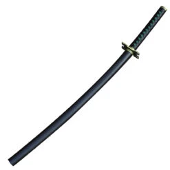 In order to become one of the highest-ranking demon slayers, known as the Nine Hashira, you must first prove your worthiness. That kind of training and dedication could not be achieved without the assistance of a reliable Nichirin, which is the sword or weapon that is specially made for a demon slayer to kill demons. In the anime, the sword is forged from scarlet crimson iron and scarlet crimson ore, which are collected from the mountains. Though we may not be able to obtain these exact materials, we have nonetheless created a fierce katana for your anime collection. This replica katana is made to look just like the sword owned by Muichiro Tokito, who is a very powerful member of the nine Hashira in the series. The blade is constructed of high carbon steel with a factory edge and polished finish. Etched onto the blade of the katana are the Japanese Kanji for “Destroy Demons”. An emerald green faux ray skin handle is wrapped meticulously with black faux leather in a traditional Japanese Style. The steel hand guard features a geometric design in a gold boarder and center. Included with this beautiful collectible katana sword is a hard matte black scabbard with gold accents to house your blade when not defeating demons. Overall Length: 38 inches, Blade Length: 26.75 inches
