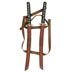 Both swords are made from stainless steel with a dulled edge making these swords the perfect finishing touch with everyones favorite ant-heros costume. The handles are constructed from wood with a faux ray skin wrap, double menuki, and a rexin itos. The guards are shaped in traditional Japanese design. They are made from zinc with an antiques brush finish. The scabbards are made from wood with cutouts on both tips. The back sheath has to be the best part of this set. It comes adjustable and made from rexin. It holds both scabbards simultaneously so you can kick butt and take names. Overall Length: 28.75 Inches.