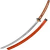 That’s right, this is indeed the one of the 3 swords previously carried by the legendary Pirate Hunter turned pirate himself in the very popular anime series we all know and love. This sword is one of the 21 Great Grade Meito wielded by a legendary samurai. The pirate hunter was bestowed the sword by the corpse of this samurai, and later returned it to his grave after being given a replacement sword. We have replicated every detail of this sword in the anime from end to tip just for your collection. Constructed from carbon steel, this replica of the famous sword will not disappoint. The blade is a full 29-inches in length and sports a sleek black and silver finish. The handle features faux white ray skin that is wrapped in black rayon in a traditional Japanese style. The metal guard is made into a flower-like design with a brass finish. Included with this gorgeous sword is a matching scabbard complete with a black lacquer finish, gold-toned metal adornments and a purple circular pattern that runs down either side. Overall length: 41 inches, Blade length: 29 inches